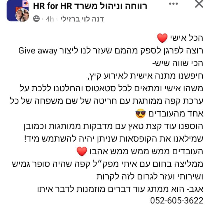 הכל אישי♥ רוצה לפרגן לספק מהמם שעזר לנו ליצר GIVE AWAY הכי שוווה שיש- חיפשנו מתנה אישית לאירוע קיץ, משהו אישי ומתאים לכל סטאטוס והחלטנו ללכת על ערכת קפה ממותגת עם חריטה של שם משפחה של כל אחד מהעובדים! ממליצה בחום על איתי ממיתוגברנד שהיה סופר גמיש ושירותי ועזר לגרום לזה לקרות!